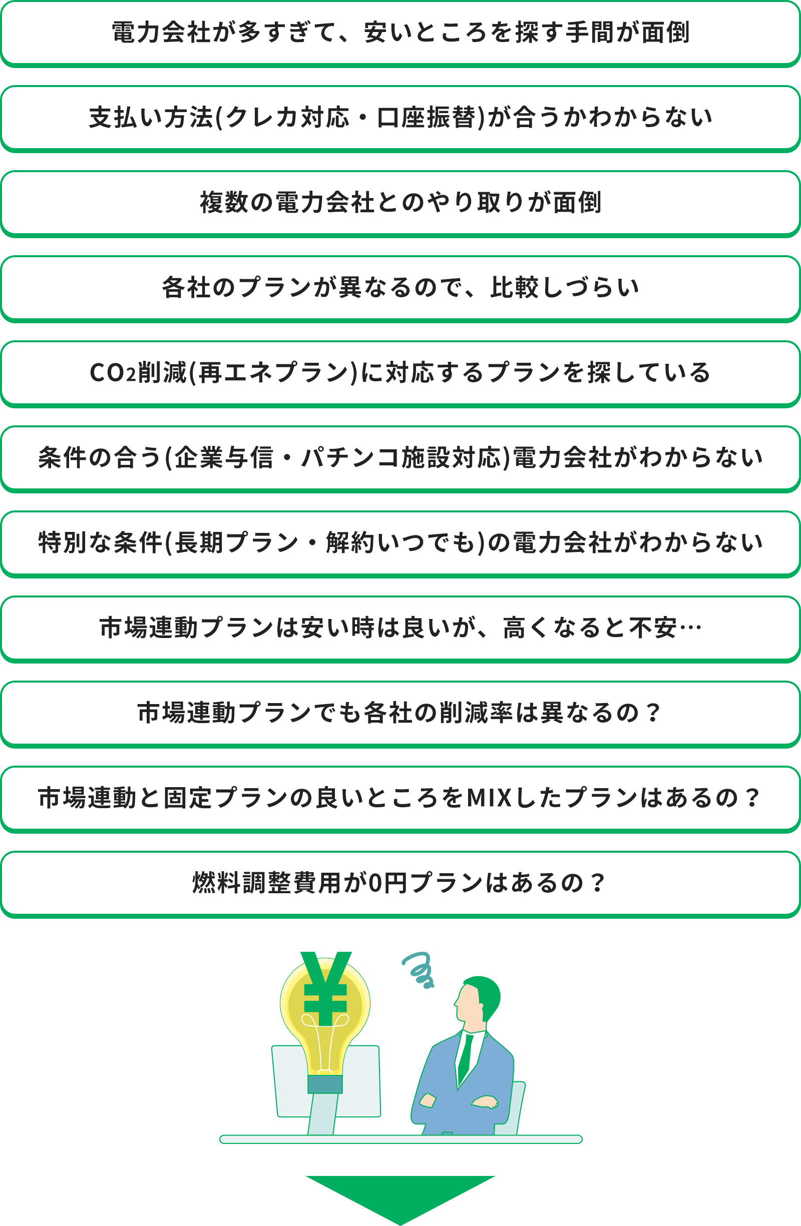 切り替えに関するご相談から切り替えが完了するまで、弊社の経験豊富な電力コンサルタントが、すべて無料でサポートいたしますので安心してお気軽に見積り依頼ができます。