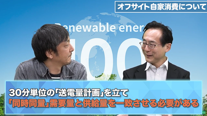 電気を使う需要家であればあるほど、自社の敷地だけだと追いつかないんで、そういう意味ではオフサイト自家消費っていうのは、今後、再生可能エネルギー100%を目指すような企業さんにとっては絶対必要なスキームではありますよね。